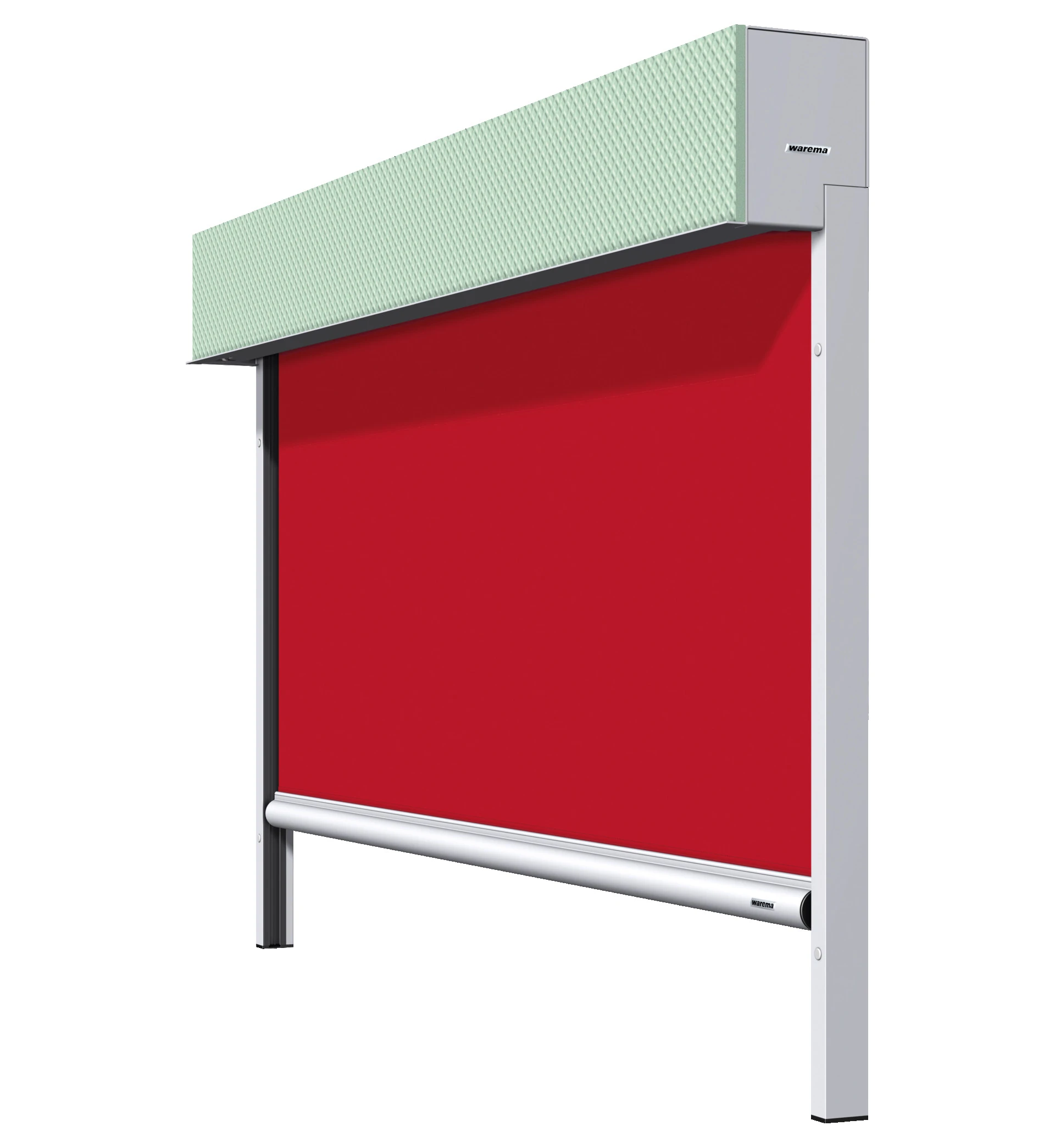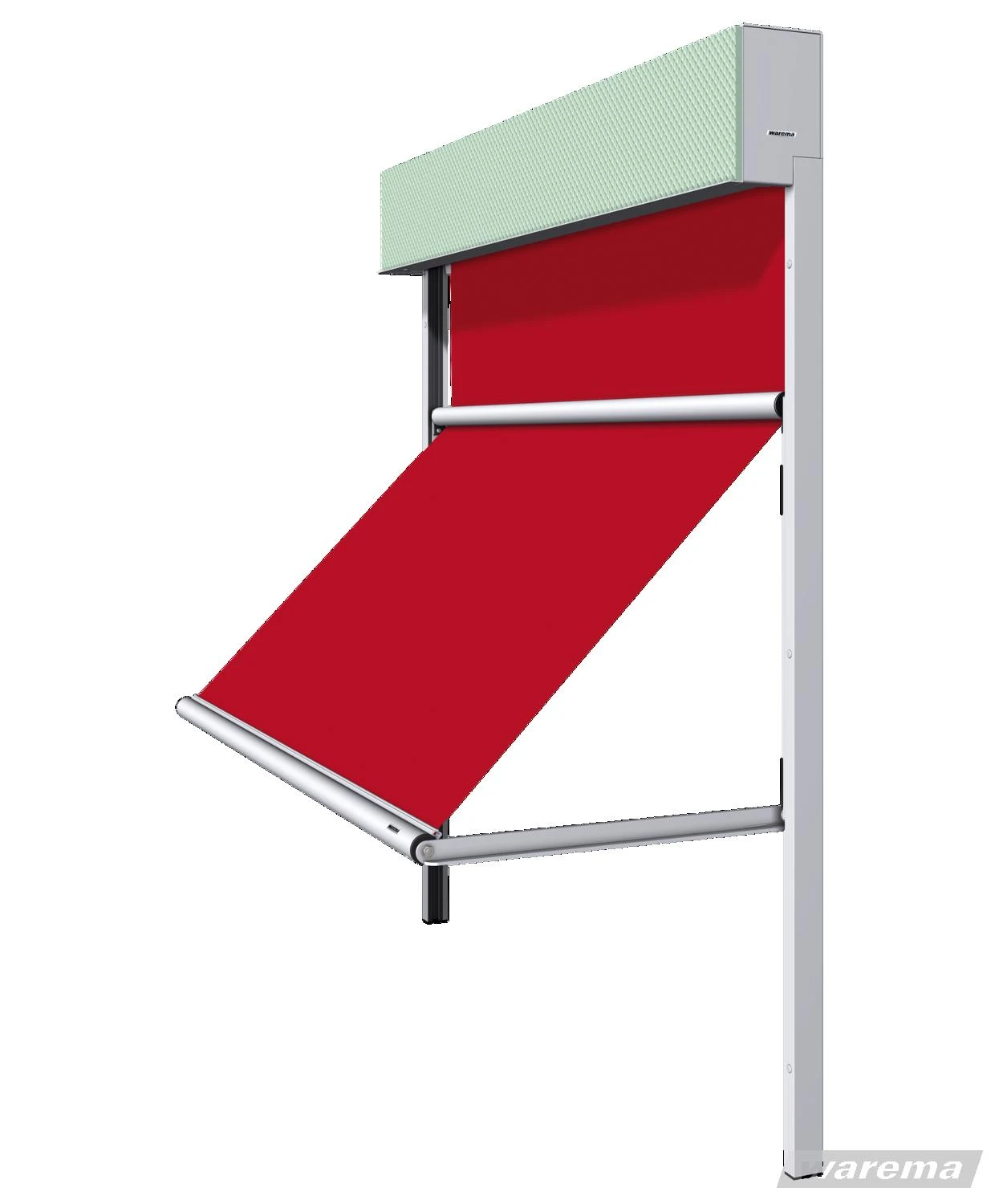 Markise in Rot mit grünem verputzbaren Kasten und Schienenführung
